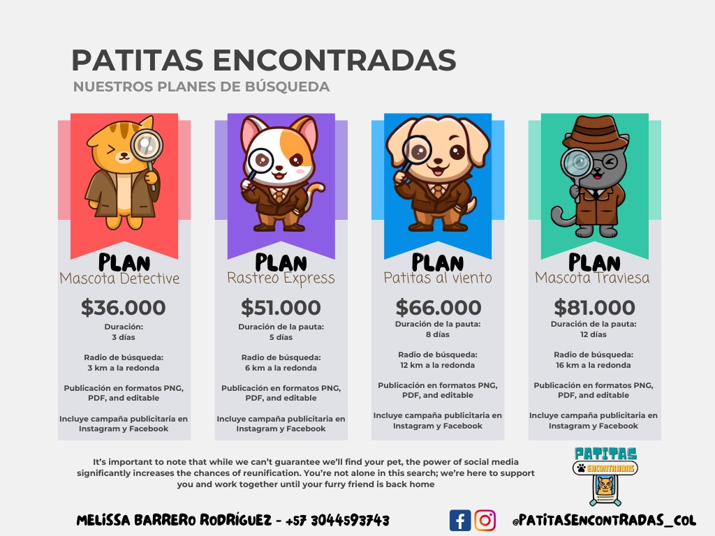 Puedes ponerte en contacto con nosotros a través de whatsapp al 3116409850. Danos detalles sobre tu mascota y la zona donde se perdió para que podamos crear una campaña efectiva.